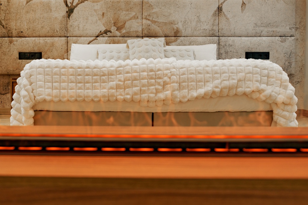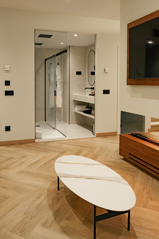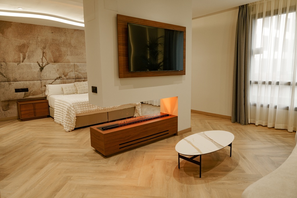 Nuestra Suite Privilege combina amplitud, estilo y bienestar en un espacio pensado para una estancia excepcional. Disfruta de una cama king 2x2 que garantiza máximo descanso, un jacuzzi privado ideal para relajarte, dos televisores para tu entretenimiento y una acogedora chimenea eléctrica que aporta calidez y encanto. Un ambiente único diseñado para vivir momentos de confort absoluto y desconexión total.